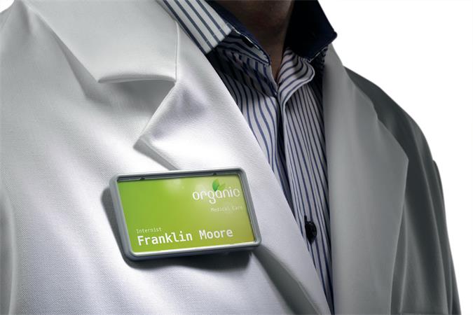Elegáns névkitűző, színes kerettel és karcálló fedlappal.