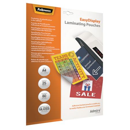 Meleglamináló fólia, 80 mikron, A4, fényes, öntapadó, 25 db, FELLOWES "Admire Easy Display"