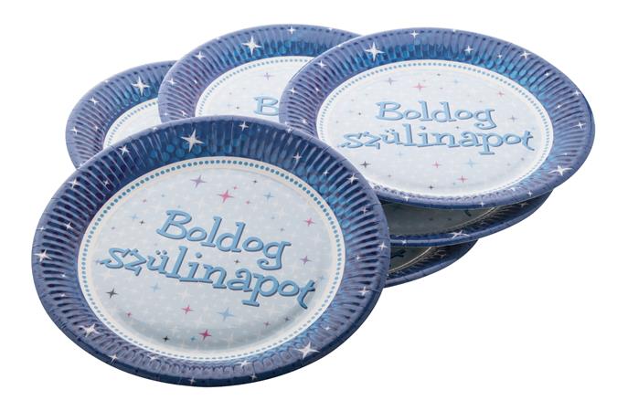 Tányér, papír, 23 cm, "Boldog Születésnapot", kék
